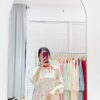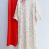 - Họa tiết: Những nhành hoa nhí đa sắc màu (cam, hồng, xanh) được điểm xuyết nhẹ nhàng trên nền áo trắng kem, tạo nên tổng thể thanh lịch, trẻ trung và cực kỳ nịnh da.