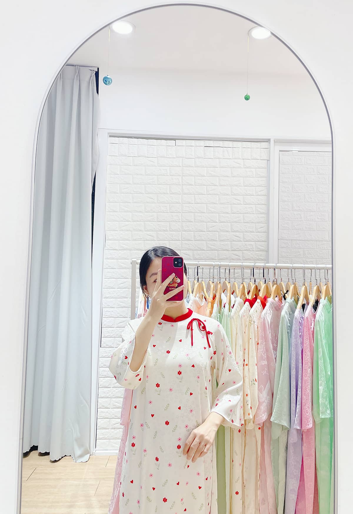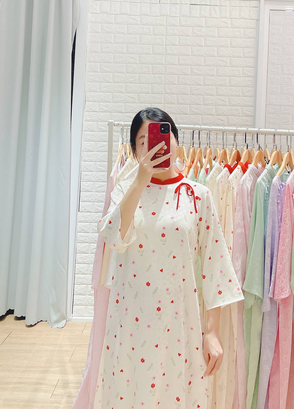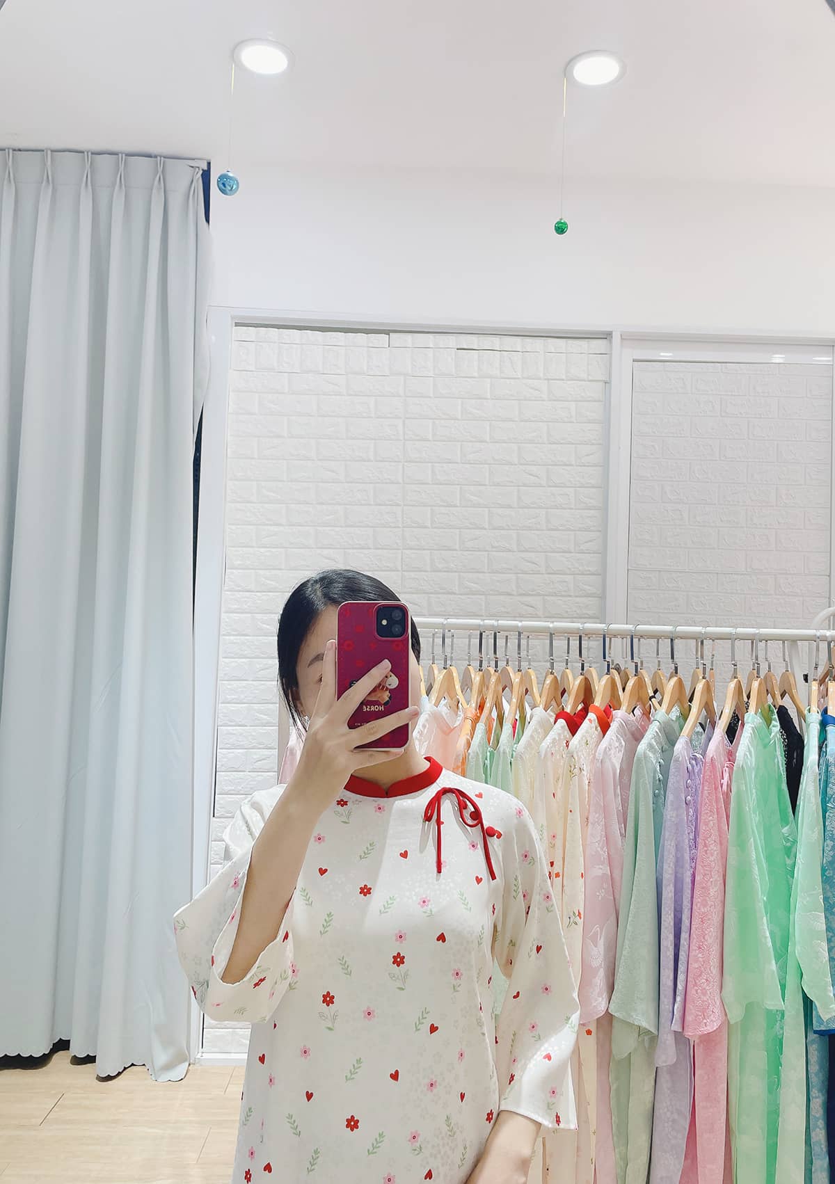 - Họa tiết: Những bông hoa nhí và trái tim đỏ nhỏ nhắn trên nền trắng kem cực kỳ tôn da và không bao giờ lỗi mốt.