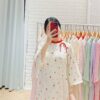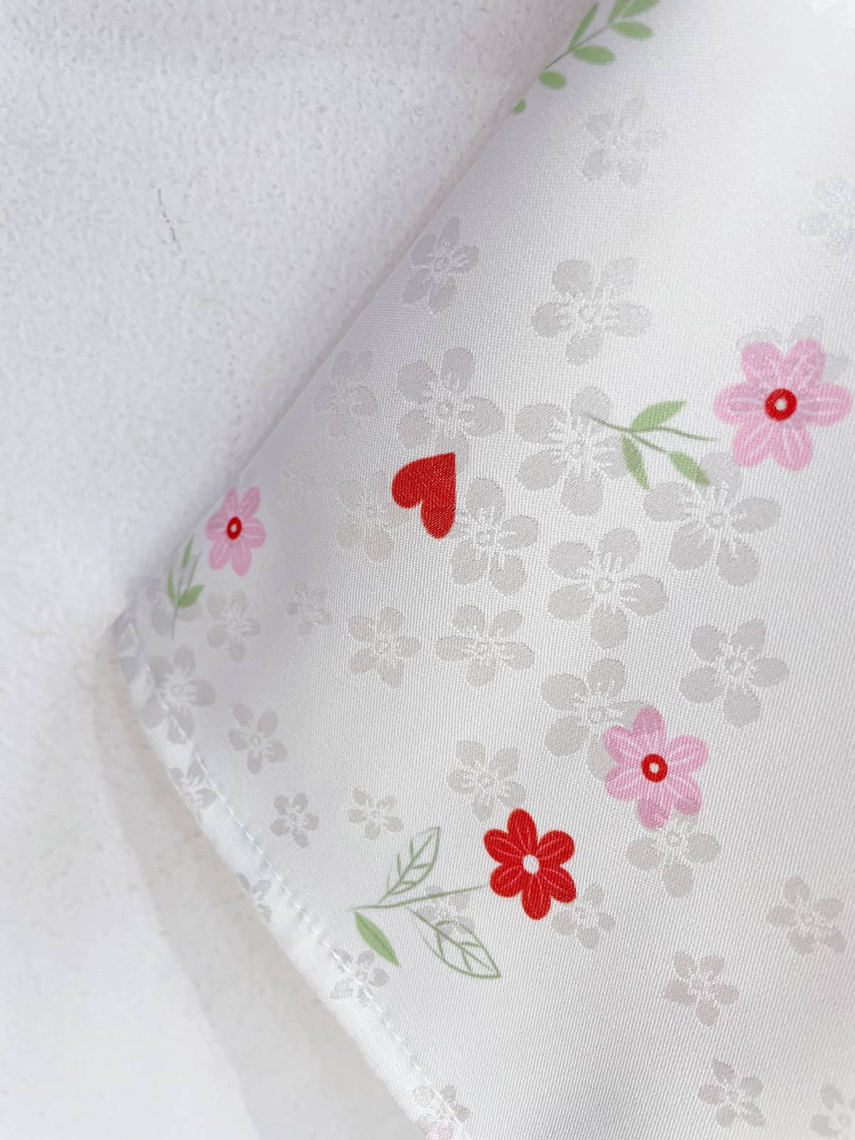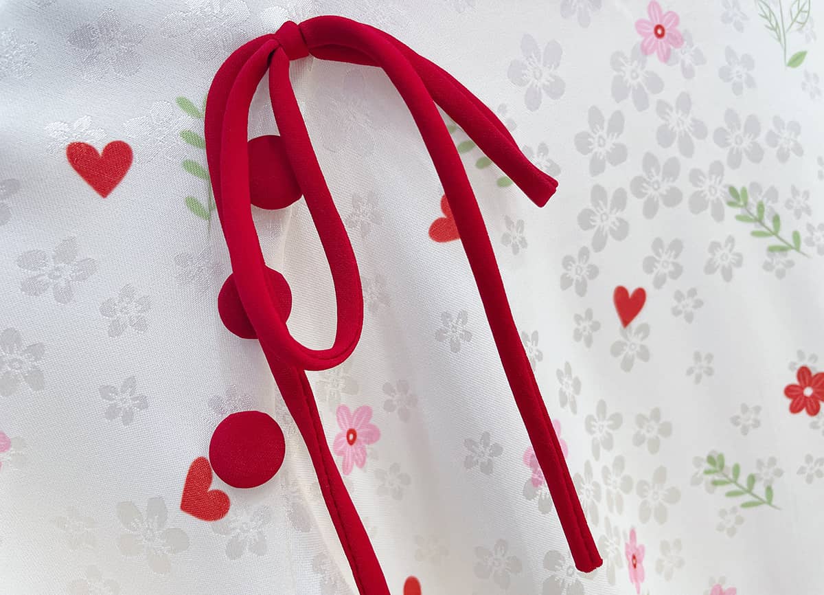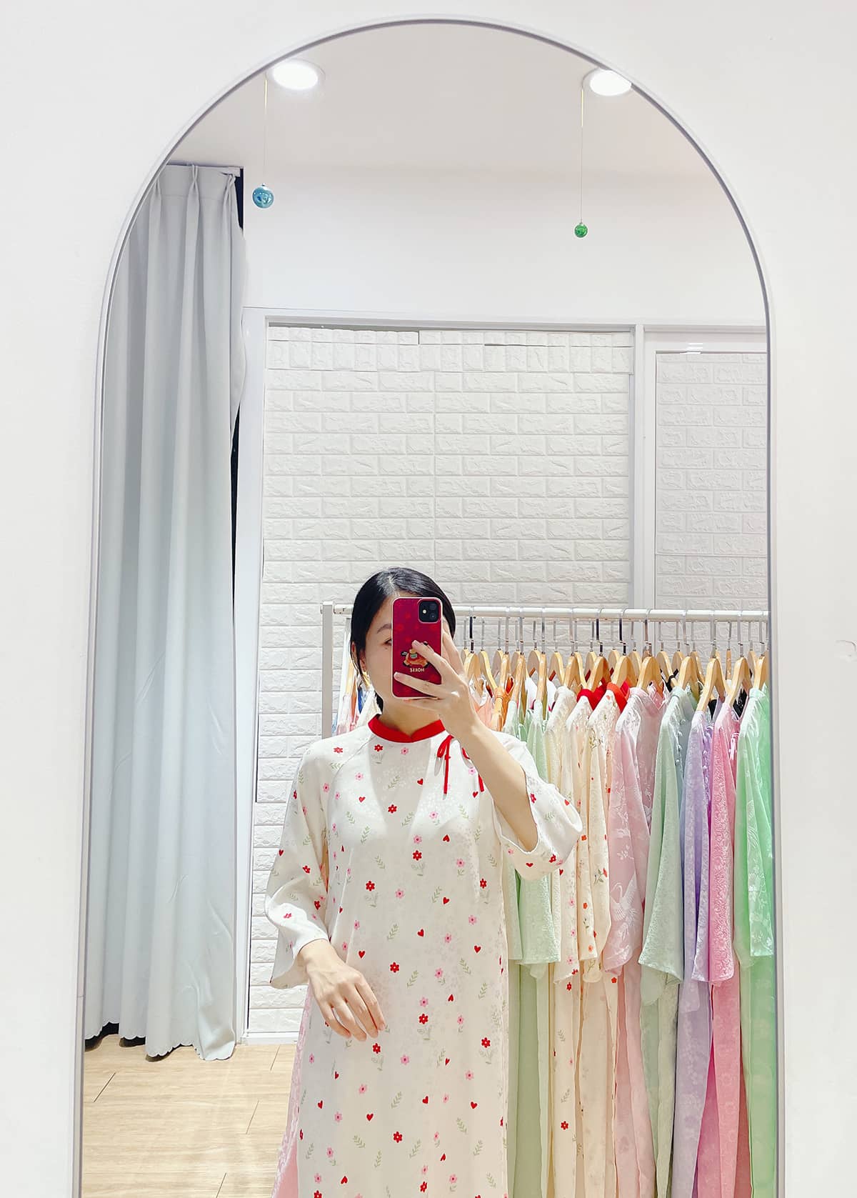 - Họa tiết: Những bông hoa nhí và trái tim đỏ nhỏ nhắn trên nền trắng kem cực kỳ tôn da và không bao giờ lỗi mốt.